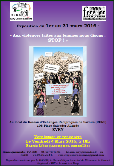 Une première partie de l’exposition « violences faites aux femmes : une lutte internationale » a été créée en 2014, ce sont des panneaux qui abordent différents sujets sur les violences faites aux femmes (l'excision, le système prostitutionnel, le viol, les violences conjugales et économiques).