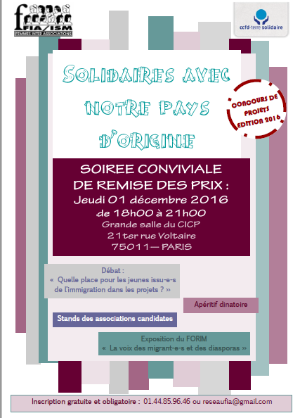 Dans le cadre de notre concours de projets "Solidaires avec notre pays d'origine", nous vous invitons à la soirée conviviale de remise des prix qui se déroulera le 01 décembre prochain à partir de 18h00 dans le 11ème arrondissement.